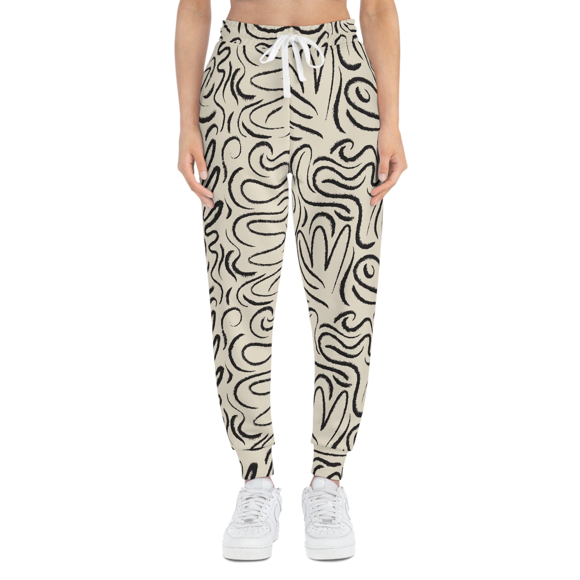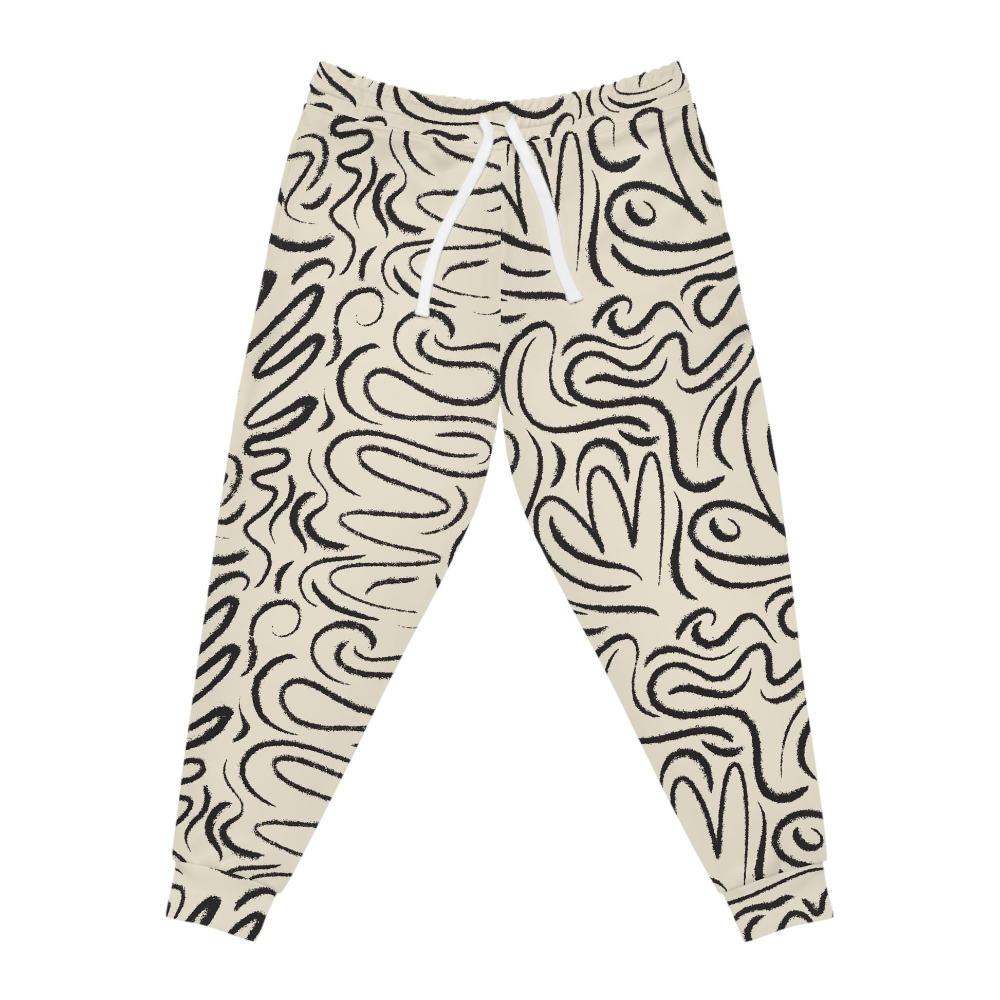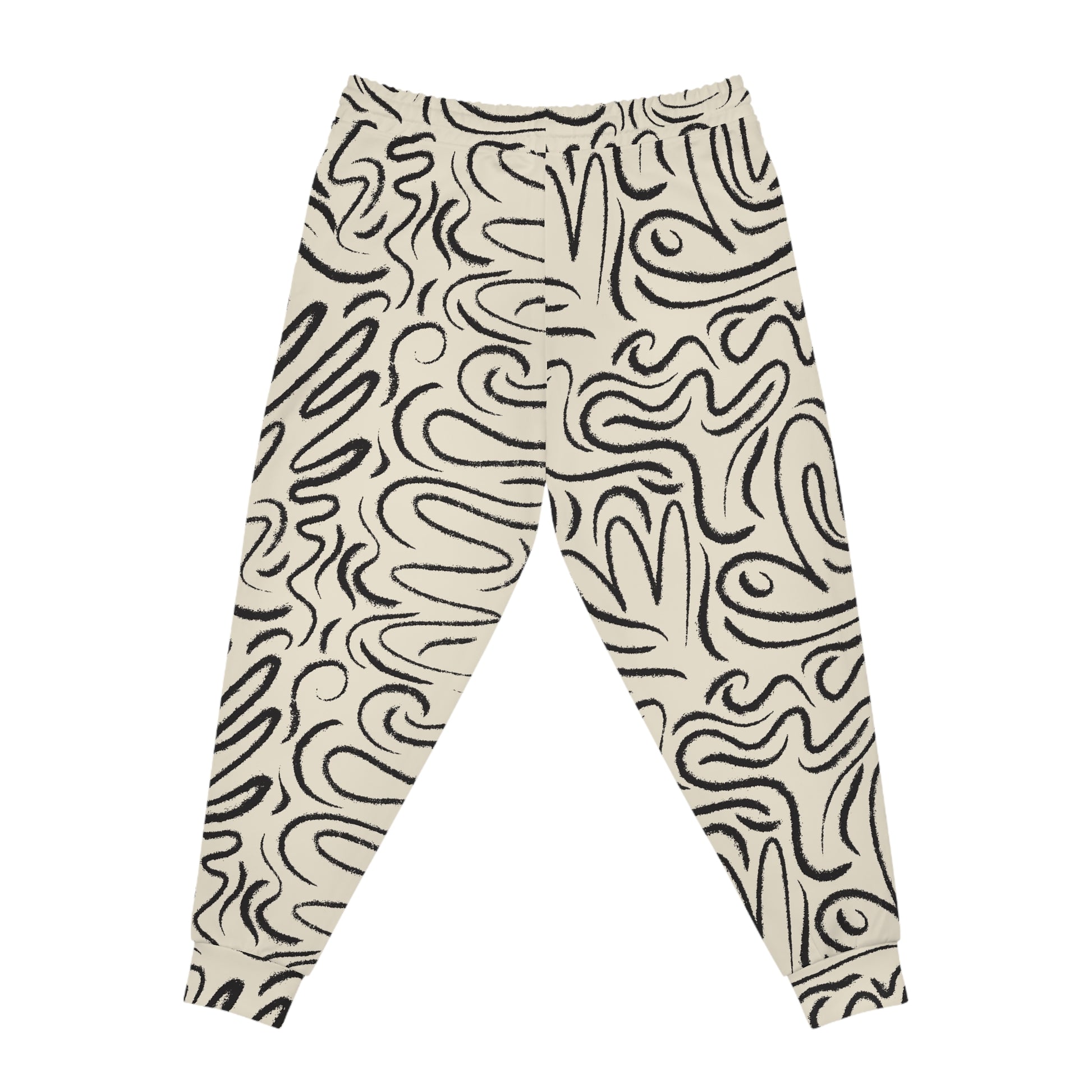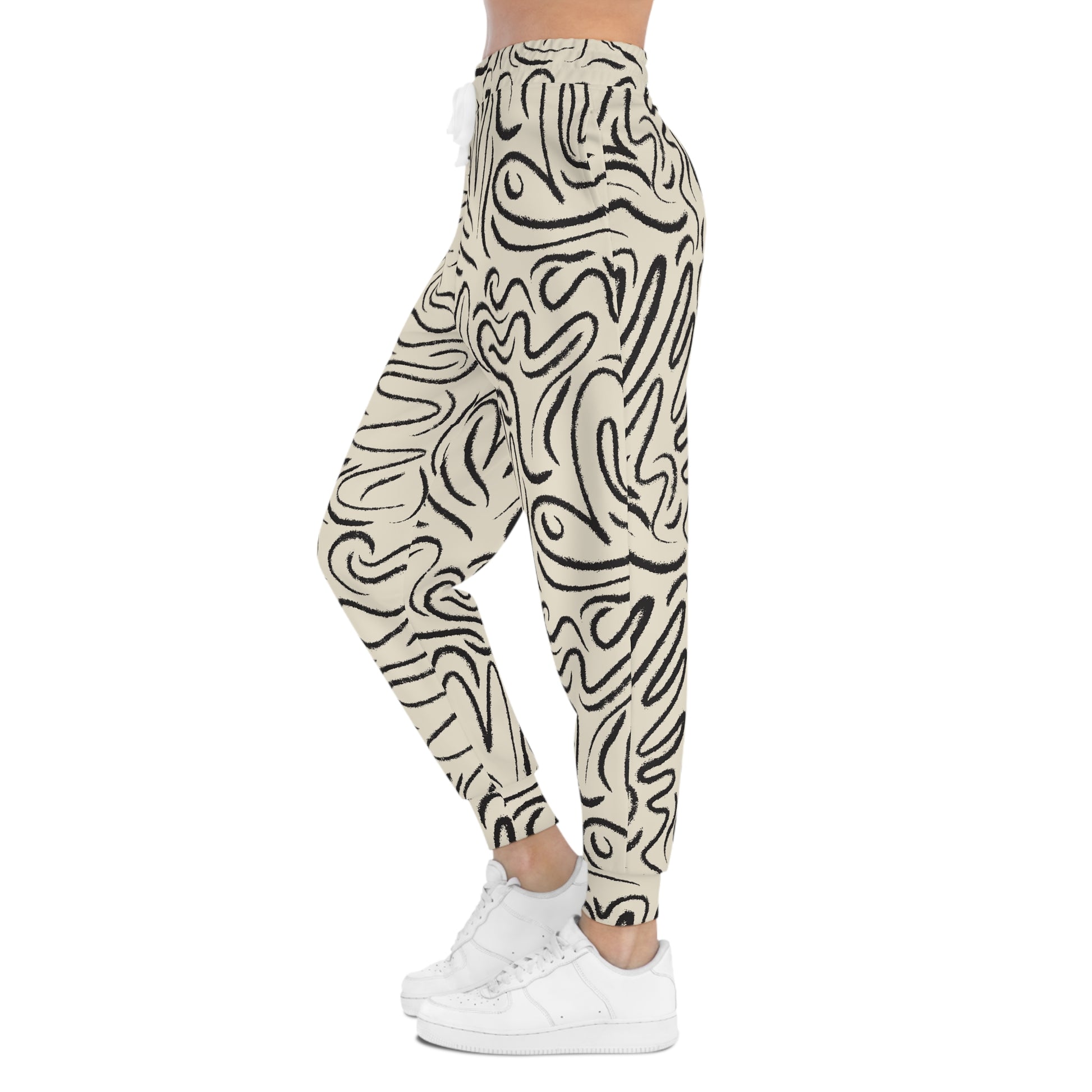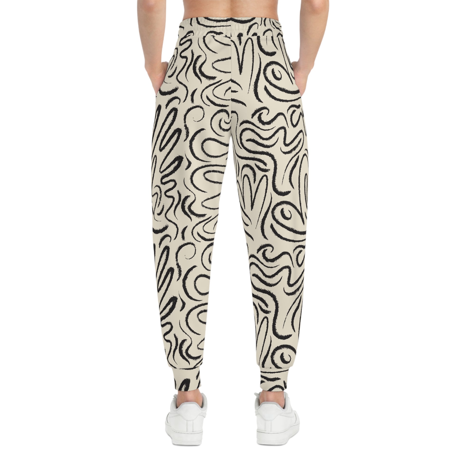 These joggers bring quiet confidence to your everyday rhythm. One leg wears a hand-drawn, organic swirl pattern in ink-black over a warm cream ground, while the other stays clean white — a subtle asymmetry that reads modern and lived-in. The fabric is soft, lightly stretchy, and structured enough to move with you from morning coffee runs to low-key studio sessions. Deep double-layer pockets and an adjustable drawstring give functional comfort, and the all-over print means the pattern feels like it’s always part of the garment, not just slapped on. Wear them when you want something that feels personal, a little artistic, and entirely comfortable.