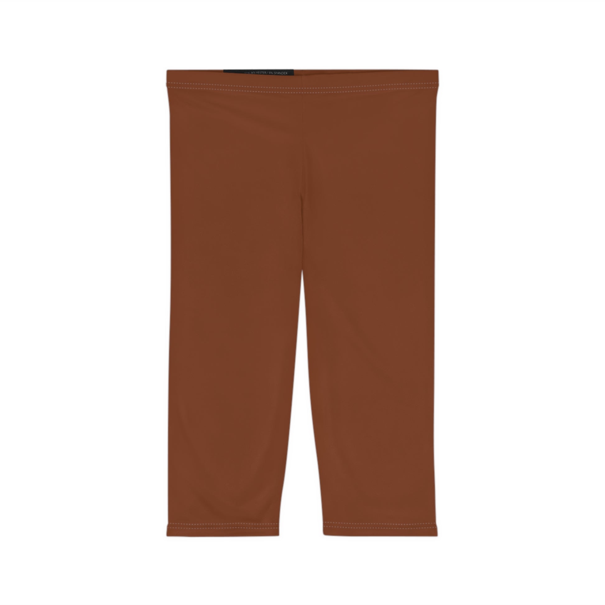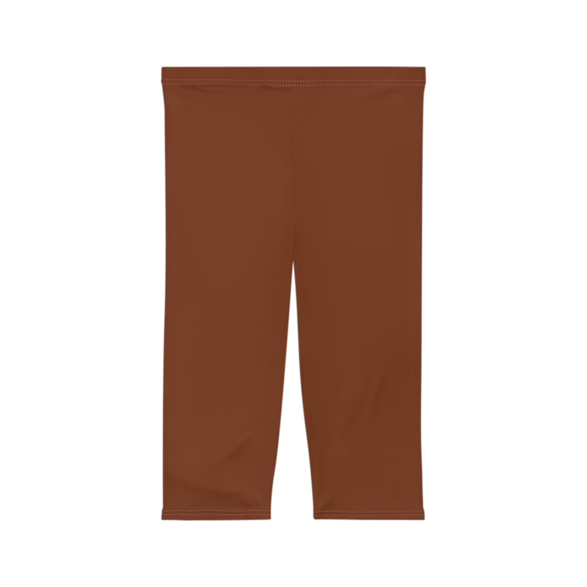 Brown capri leggings that feel like a second skin. Lightweight, brushed-suede fabric drapes smoothly and breathes as you move, while a mid-rise 1.5" waistband sits comfortably at the hips without digging in. These skinny-fit capris wick moisture and resist odors thanks to an antimicrobial polyester-spandex blend, so they stay fresh through walks, studio classes, and long days out. Clean white topstitching and a printed size/care label at the waistband keep the interior smooth against skin. Wear them layered under dresses, with oversized sweaters, or styled for low-key weekend errands — they ground an outfit with warm, earthy tone and reliable performance.