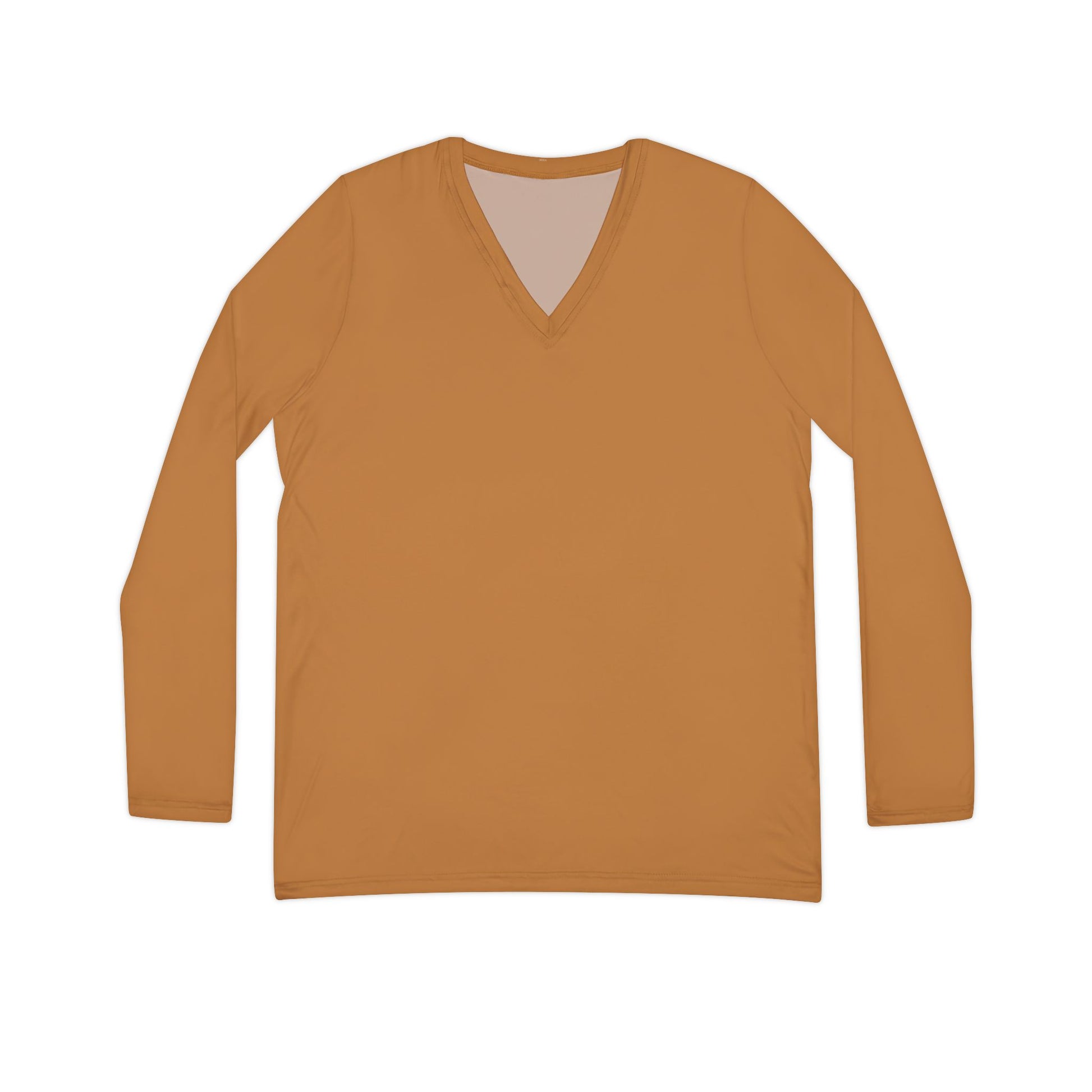 Soft, lightweight long-sleeve V-neck that moves with you. This slim, drapey top feels like a second skin — breathable polyester with a touch of stretch so it layers easily under jackets or stands alone on cool days. The clean V neckline and smooth, all-over color make it quietly stylish for everyday wear: running errands, coffee shop afternoons, or a relaxed desk day. Thoughtful details like double-needle stitching and a printed care label keep things simple and comfortable season after season. Assembled in the USA from globally sourced parts, it’s built for active routines and slow Sundays alike.